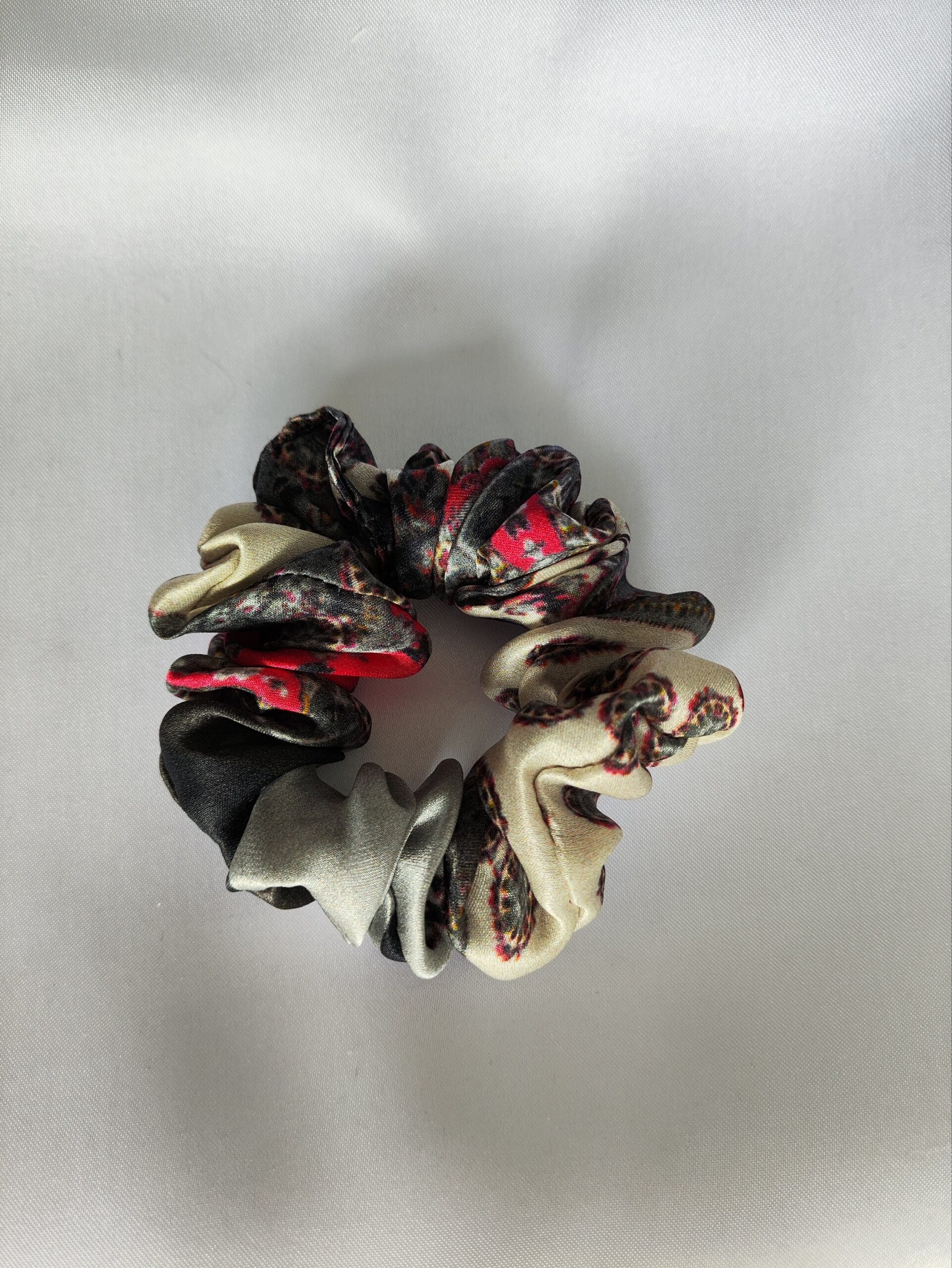Wyjątkowa, satynowa gumka do włosów w pięknym szarym kolorze w czarno-czerwony print wykonana jest w 100% z naturalnego jedwabiu morwowego, co gwarantuje niezwykłą delikatność i elegancję.